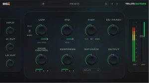 With Telos Guitars, EQ, compression, saturation, and dynamic control are all integrated into one intuitive interface. No more juggling 3–5 plugins—everything you need is streamlined in a single tool.